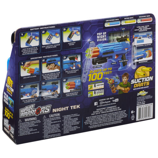 De BuzzBee Air Warriors Night Tek blaster heeft een uniek nachtzichtvizier. De blaster heeft een capaciteit voor 6 pijltjes die makkelijk te laden zijn, en schiet er 1 tegelijk. Als je de trekker half overhaalt klapt het nachtzichtvizier omhoog en wordt het licht geactiveerd. Het vizier werkt op 2 AA batterijen. (apart verkrijgbaar)