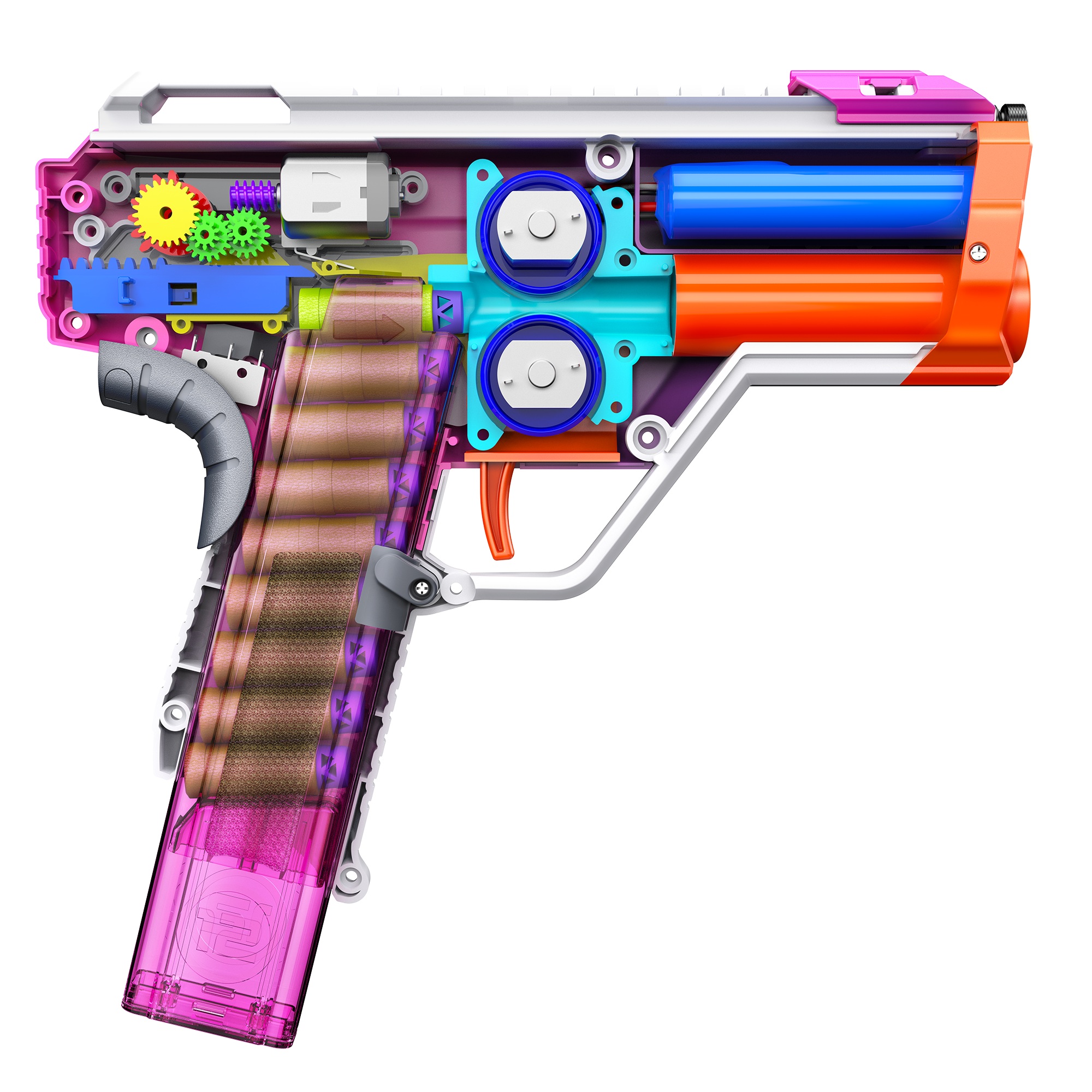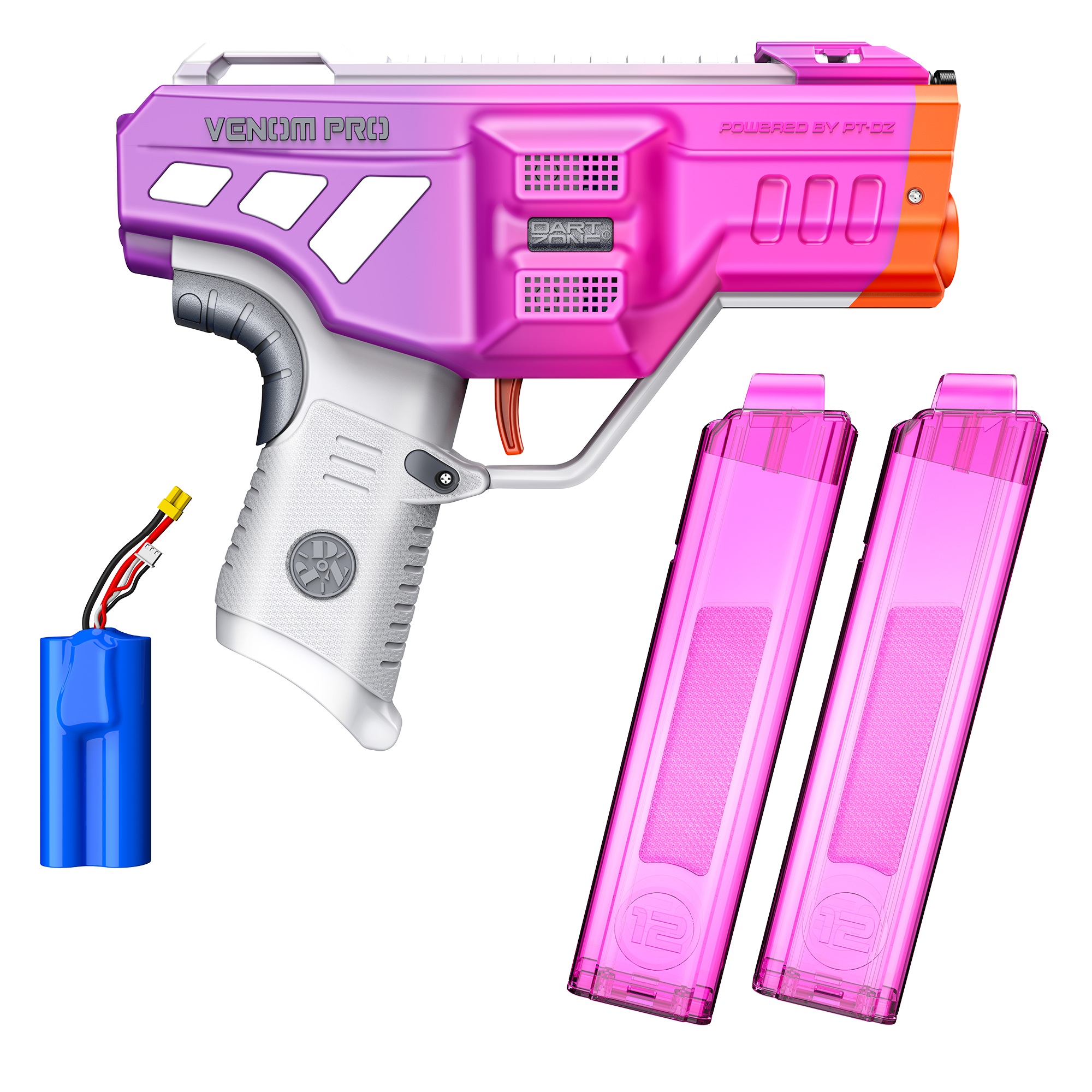 De Dart Zone Max Nitroshot+ Venom Pro – UV Purple is een speciale editie van de normale Dart Zone Venom Pro. Deze speciale editie verandert van kleur onder UV-licht: felroze zonder UV licht en paars in UV licht. Hoe sterker het zonlicht, hoe donkerder het paars. Ga je terug de schaduw in? Dan keert het roze terug. De Nitroshot+ Venom Pro is volledig automatisch en schiet tot 7 pijltjes per seconde af met een indrukwekkende snelheid van 130 FPS. De unieke handgreep met rev-trigger zorgt voor comfortabel en nauwkeurig schieten, zelfs tijdens intense blaster battles. Wordt geleverd met twee roze magazijnen voor korte pijltjes en 24 Nitroshot+ pijltjes. De blaster is compatibel met Worker MINI talon magazijnen. De meegeleverde 7.4V (2S) 1000 mAh lithium-ion batterij met XT30-connector laad je eenvoudig op via de meegeleverde USB-kabel.