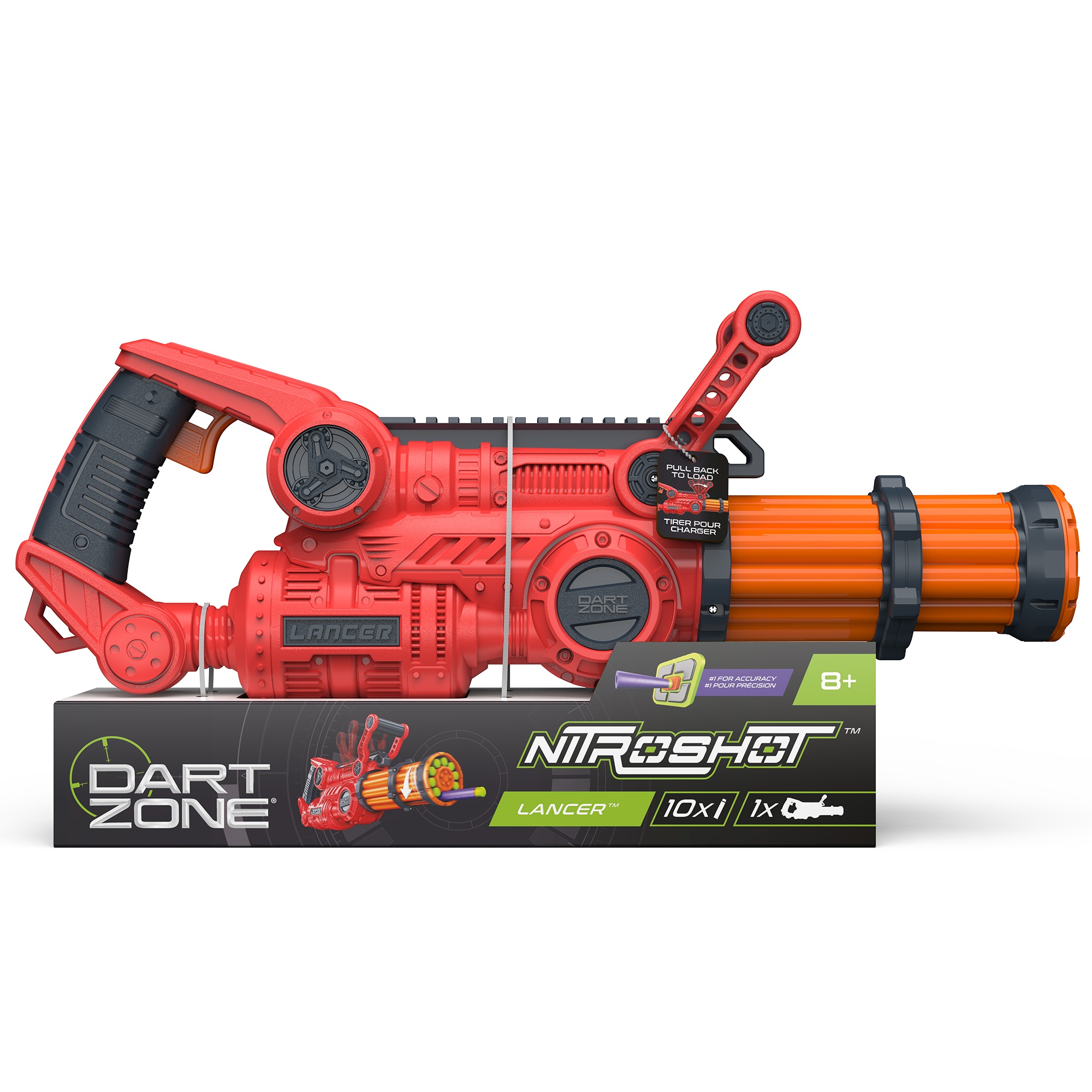De Dart Zone Nitroshot Lancer is een compacte krachtpatser. Met een roterende trommel voor 10 pijltjes en een handige top-prime voor snelle herlaadacties, is de Lancer ideaal voor intense blaster battles. Dankzij het compacte ontwerp kun je de blaster eenvoudig overal mee naartoe nemen. Deze blaster wordt geleverd met 10 Nitroshot pijltjes.
