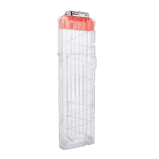 Met dit magazijn zit je nooit meer zonder pijltjes in een gevecht! In het magazijn passen wel 18 pijltjes. Het magazijn werkt ook in alle andere NERF blasters die een magazijn voor standaard formaat pijltjes gebruiken. Het magazijn is leverbaar in 4 kleuren: Oranje, Transparant, Half Oranje / Half Transparant en in Transparant Oranje. Kies je favoriete kleur!