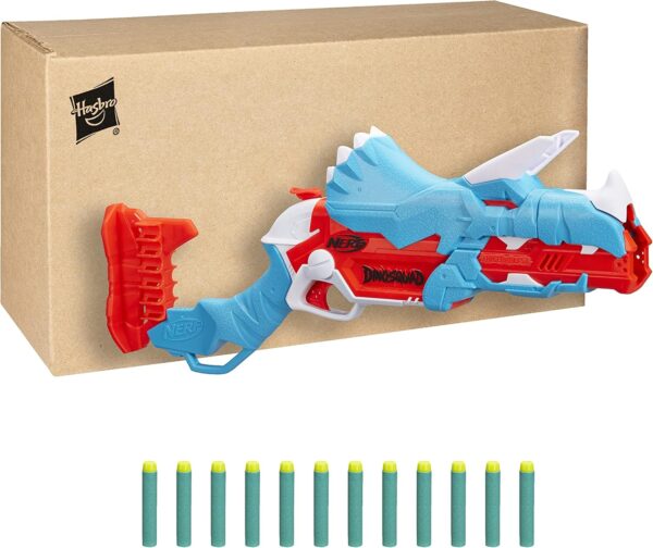 De NERF DinoSquad Tricera-blast is een blaster met een hamer, en schiet 1 pijltje tegelijk. De Tricerablast heeft een cool dinosaurus ontwerp met de looks van een Triceratops dinosaurus. De blaster heeft een voorkant die openklapt, waardoor je makkelijk 3 pijltjes kunt laden. Op de schouderstuen van de blaster is ruimte voor 12 pijltjes. Wordt geleverd met 12 Nerf Elite pijltjes.