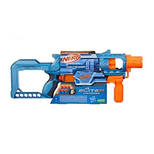 Met de NERF Elite 2.0 Contender ben je klaar voor actie! Deze blaster combineert een unieke uitstraling met betrouwbare prestaties. De Contender is een veeraangedreven blaster met een bolt-action mechanisme en een roterebde drum die plaats biedt voor 6 pijltjes. In de schoudersteun is ruimte voor 6 extra pijltjes, zodat je altijd voldoende pijljtes bij de hand hebt. Het blauw-oranje design maakt deze blaster een opvallende verschijning in elke blaster battle. Inclusief 6 NERF Elite pijltjes.