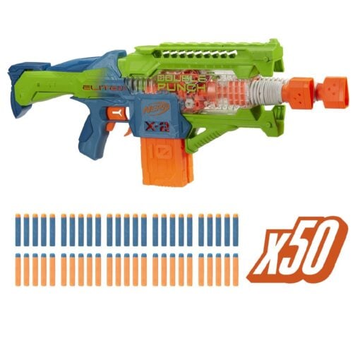De NERF Elite 2.0 Double Punch is een gemotoriseerde blaster die schiet uit 2 lopen en waar 2 magazijnen in passen! De Double Punch heeft 2 bewegende lopen, die heen en weer bewegen als je schiet. De pijltjes worden geladen in 2 magazijnen, in elk magazijn passen 10 pijltjes. De Double Punch schiet een pijltje als je de trekker overhaalt, en nog een als je de trekker weer loslaat. Er is extra opslagruimte voor pijltjes boven in de blaster. De blaster wordt geleverd met 50 Nerf Elite pijltjes. Werkt op 4 AA-batterijen (apart verkrijgbaar).