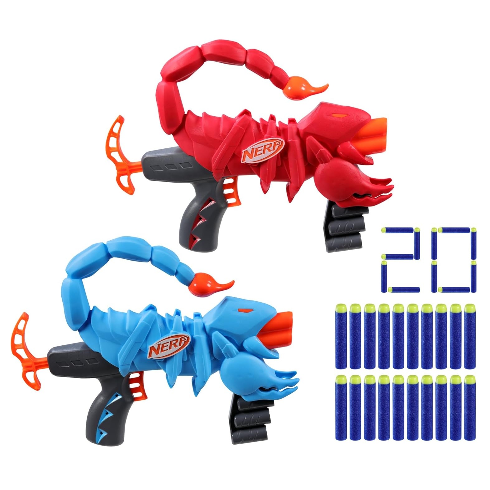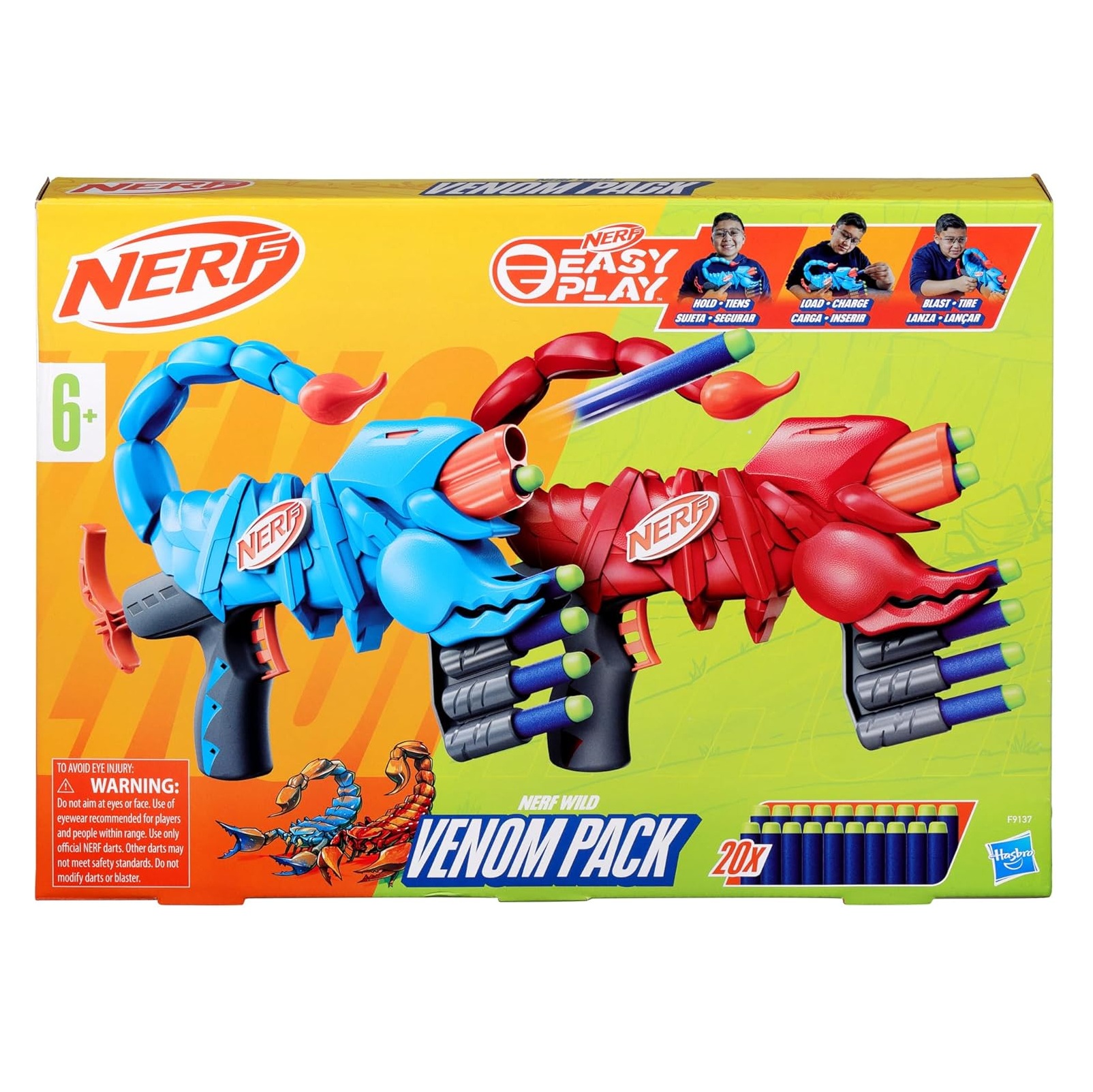De NERF Elite Junior Wild Venom Pack brengt dubbele actie in een stoer design! Deze set bevat twee blasters in de vorm van een schorpioen – één in het blauw en één in het rood. Elke blaster is eenvoudig te gebruiken met een multi-finger trekker en pull-back prime aan de achterkant. De loop heeft ruimte voor 2 pijltjes, en onder de loop is ruimte om 4 extra pijltjes op te bergen. De ergonomische grip is speciaal ontworpen voor kleine handen. Met in totaal 20 NERF Elite pijltjes ben je klaar voor een duel met stijl!