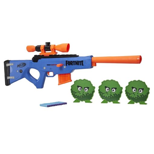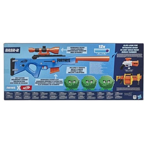 De NERF Fortnite BASR-R is een bolt-action Nerf sniper blaster gebaseerd op de legendary Bolt-Action Sniper Rifle van Fortnite. De veer van de blaster wordt gespannen met de hendel aan de zijkant. Op de bovenkant van de blaster vind je Nerf tactical rail om het meegeleverde vizier te monteren. De blaster wordt geleverd met een magazijn voor 6 pijltjes, 12 Fornite Nerf Elite pijltjes en 3 Bush targets om op te schieten.