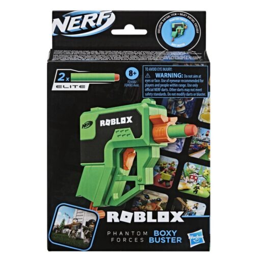 De Nerf MicroShots Roblox Phantom Force: Boxy Buster is een kleine blaster geïnspireerd door het Roblox spel: Phantom Forces. De MicroShots blasters zijn enkelschots blasters: je kunt 1 pijltje laden en per keer schieten. Basis voor deze serie is de Nerf Jolt, de bekende en populaire enkelschots blaster. De blasters zijn erg leuk om mee te spelen, maar ook leuk om te verzamelen. Verzamel jij ze allemaal? Inclusief 2 Elite pijltjes en code voor uniek virtueel item in de game.