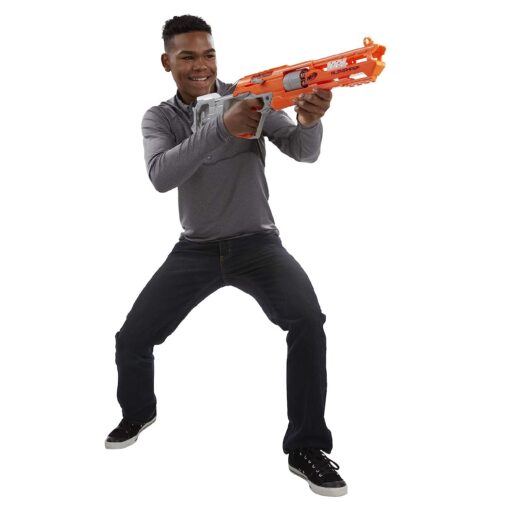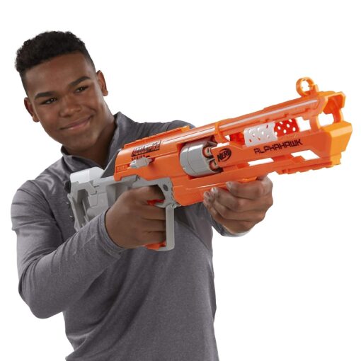 De veer van de AlphaHawk span je met de hendel aan de zijkant. Vanuit de ronddraaiende cilinder schiet je 1 pijltje tegelijk op je tegenstander af. De cilinder heeft ruimte voor 5 pijltjes. De cilinder is een voudig te herladen. Er worden 10 Accustrike pijltjes meegeleverd.