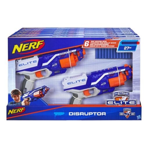 Set met 2 NERF N-Strike Elite Disruptor blasters. De Disruptor heeft een ronddraaiende cilinder waar 6 pijltjes in passen. Kies je doelwit en schiet 1 pijltje af of schiet alle 6 pijltjes razendsnel achter elkaar af met de slam-fire functie. Wordt geleverd inclusief 12 Nerf Elite pijltjes.