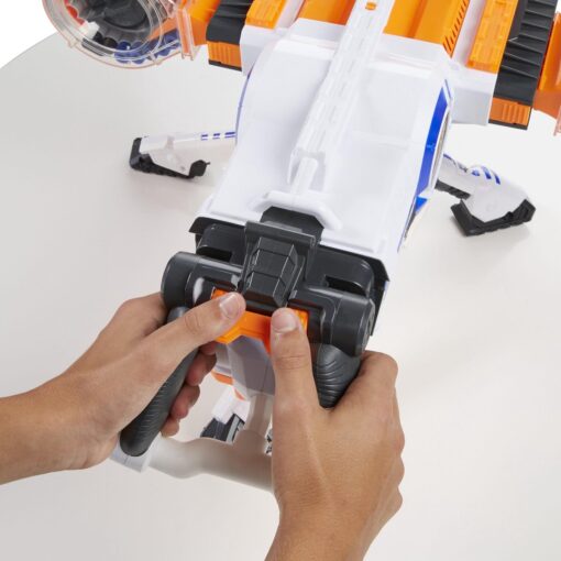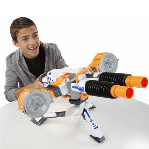 Domineer het volgende Nerf gevecht met de NERF N-Strike Elite Rhino-Fire! De Rhino-Fire schiet pijltjes uit 2 lopen. De pijltjes worden om de beurt geschoten. De loop beweegt naar achteren met elke schot. De blaster wordt geleverd met 2 drum magazijn waar 25 pijltjes in passen voor een totale capaciteit van wel 50 pijltjes! Bij de blaster worden 50 Elite pijltjes meegeleverd. De driepoot onder de blaster is verwijderbaar. De Rhino-Fire werkt op 6 D-batterijen. (apart verkrijgbaar)