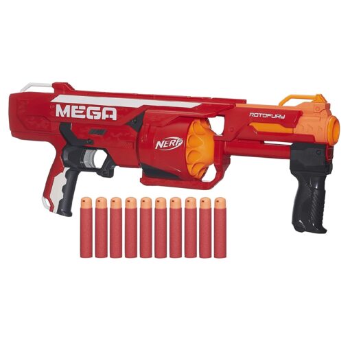 De NERF N-Strike Mega Rotofury is een grote pump-action Mega blaster waar wel 10 pijlen in passen! De Mega pijlen worden makkelijk in de grote draaiende cilinder geladen. Span de veer met de comfortabele pump-grip en je bent klaar om te schieten. Wordt geleverd inclusief 10 Nerf Mega pijlen.