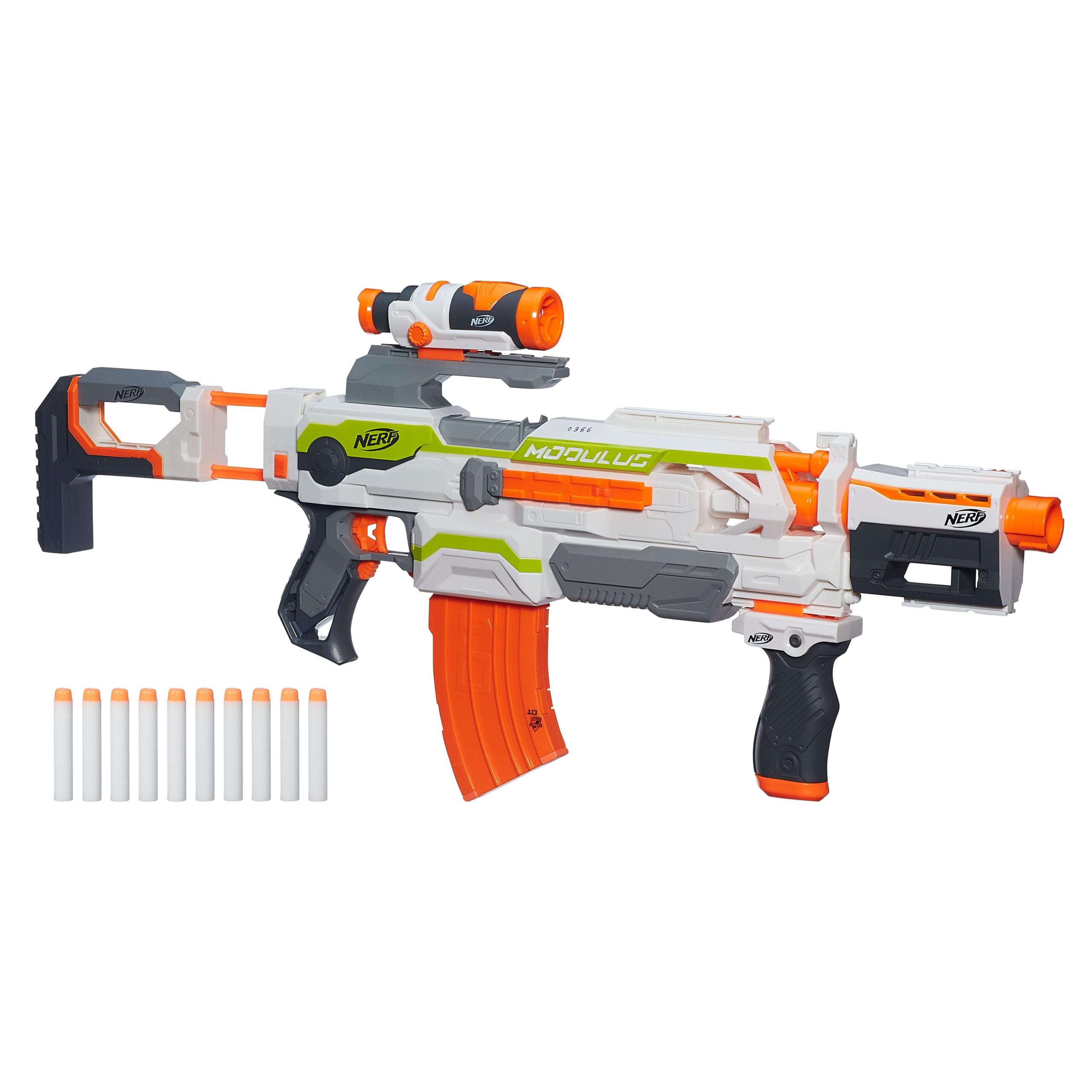 De Modulus ECS-10 is een elektrische Nerf blaster met veel accessoires. Met de onderste knop zorg je er voor dat de motoren gaan draaien. Na het richten kun je met de grote trekker de pijltjes schieten. De blaster is semi-automatisch: als je de trekker overhaalt schiet je 1 pijltje weg. Herladen gaat snel met het magazijn voor 10 pijltjes. Er zijn ook losse magazijnen verkrijgbaar die in deze blaster werken. De ECS-10 wordt met veel accessoires geleverd waaronder een extra handvat, verlengstukje voor de loop en een vizier. De blaster werkt op 4 AA-batterijen. (apart verkrijgbaar)