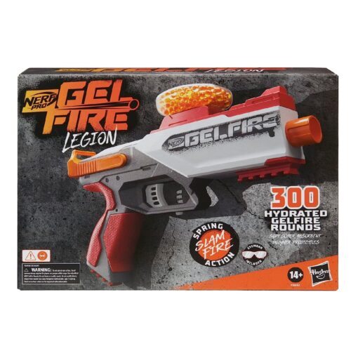 Meng je in de strijd met de Nerf Pro Gelfire Legion, een veer aangedreven Gel blaster. Deze gel blaster schiet gel balletjes op hoge snelheid die uit elkaar spatten als ze hun doel raken. Hydrateer de balletjes in water om ze klaar te maken voor gebruik. De Gelfire Legion heeft een hopper waar 130 gel balletjes in passen. De Legion schiet 1 balletje per keer en heeft slam-fire om sneller te kunnen schieten. De blaster wordt geleverd met 300 gehydrateerde gel balletjes en een veiligheidsbril.