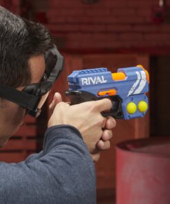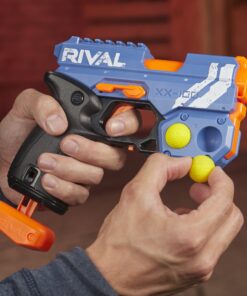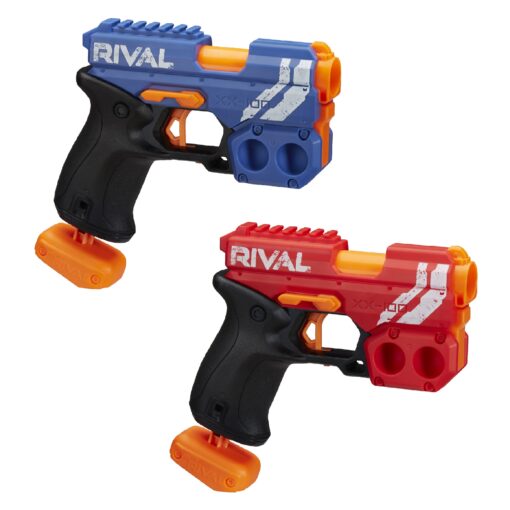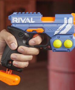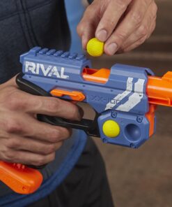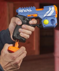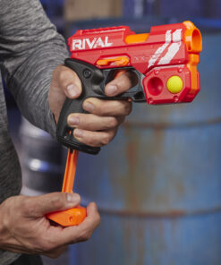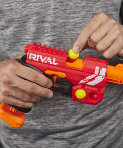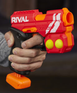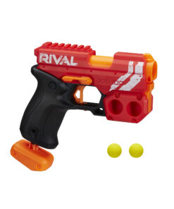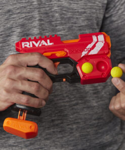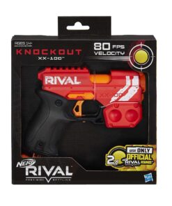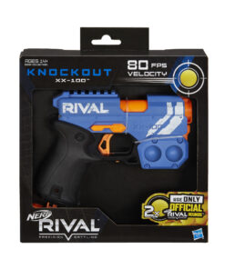 De Rival Knockout XIX-100 is een compacte Rival blaster. In de openschuivende breech laad je een balletje, en na het primen kun je die schieten. Leverbaar in 2 kleuren: Rood en Blauw. Aan de zijkant van de blaster is er ruimte om balletjes op te slaan, aan elke kant passen twee balletjes. Er worden 2 balletjes met de blaster meegeleverd. De knockout schiet iets minder hard dan de andere Rival blasters.