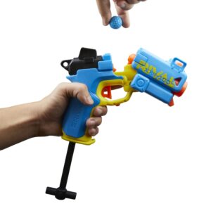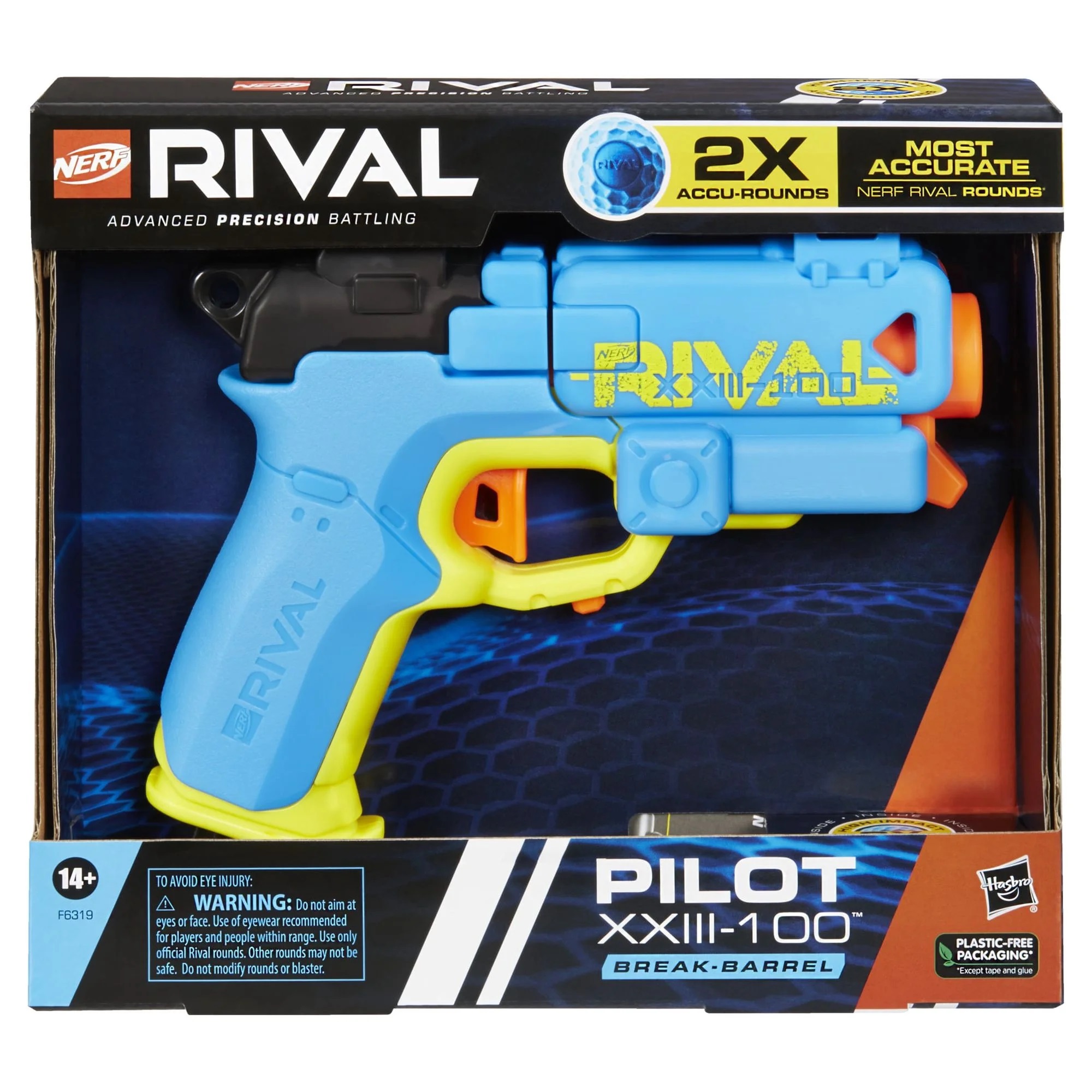 De NERF Rival Pilot XXIII-100 is een compacte, enkel-schots blaster die kracht en precisie combineert. Dankzij het break-open laadmechanisme laad je snel een Rival Accu-Round in: trek het handvat achterop naar achteren om de loop open te klappen, plaats het balletje, sluit de loop en vuur! Het handvat ligt comfortabel in de hand en maakt het spannen van de blaster eenvoudig. Het vizier op de blaster helpt bij nauwkeurig richten en de geoptimaliseerde loop zorgt voor verbeterde prestaties.