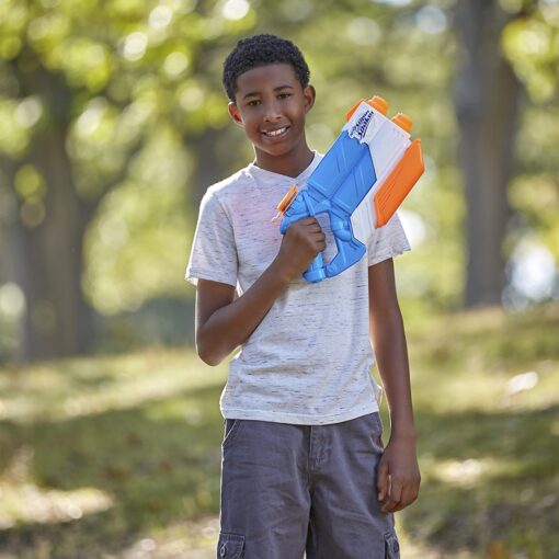 Met de NERF Super Soaker Twin Tide spuit je twee stralen water naar je tegenstander! Trek de pumpgrip naar achteren en je spuit 2x zoveel water als een andere Super Soaker. De tank van de blaster kan 975 mL water bevatten.