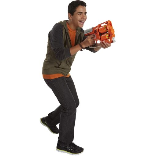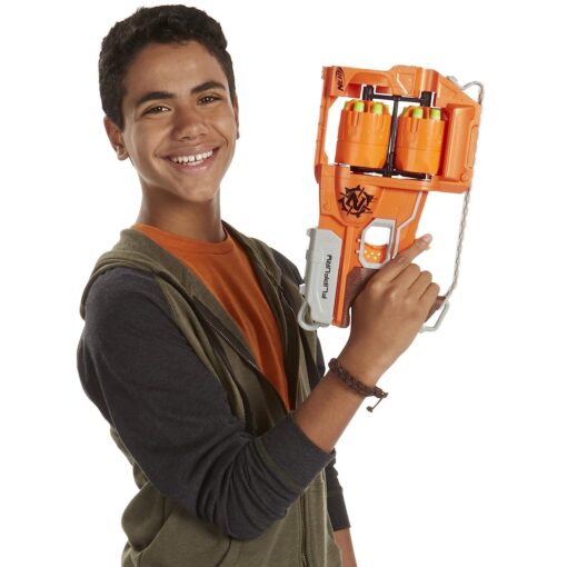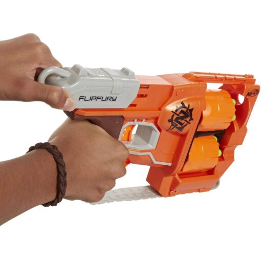 De NERF Zombie Strike Flipfury heeft twee draaiende drum, elk met ruimte voor 6 pijltjes. Schakel tussen de drums met één handbeweging en blijf schieten. Laad eenvoudig via de voorkant en gebruik de top prime om de veer te spannen. Inclusief 12 Elite pijltjes.