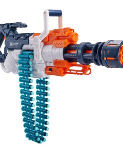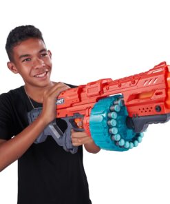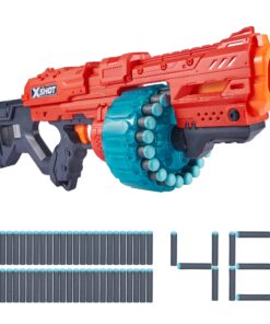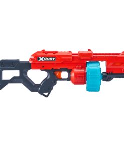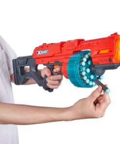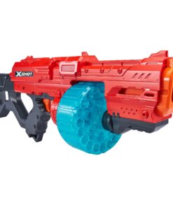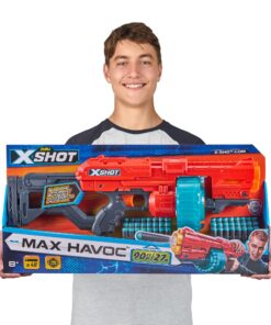 De X-Shot Max Havoc is een blaster met een roterende cylinder waar wel 20 pijltjes in passen. Door de roterende cylinder is de X-Shot Max Havoc heel eenvoudig te laden. De Max Havoc is een betrouwbare blaster die heel eenvoudig te bedienen is. Omdat de blaster slam-fire heeft kun je de pijltjes razendsnel achter elkaar wegschieten. De Max Havoc wordt geleverd inclusief 48 X-Shot pijltjes. Deze versie van de Max Havoc is uitgevoerd in rood, met een grijze schoudersteun en transparant blauwe cylinder.