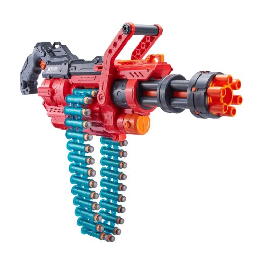 De X-Shot Excel Omega is een coole blaster waarbij de pijltjes in een riem geladen worden. De riem heeft ruimte voor 30 pijltjes, en er worden 98 pijltjes met de blaster meegeleverd. Trek de hendel aan de bovenkant naar achteren en haal de trekker over om een pijltje af te schieten. Je kunt de riem ook sneller legen door gebruik te maken van Slam-Fire. De loop van de blaster draait na elk schot.