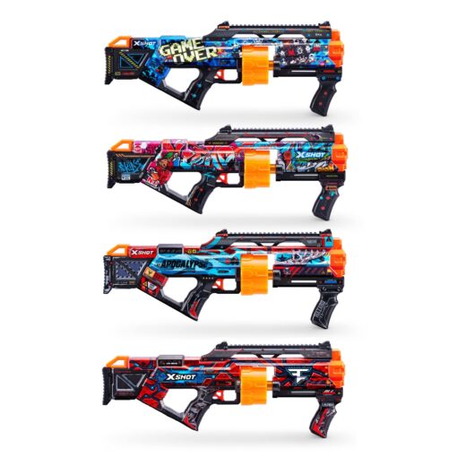 Kies je Skin en ga de strijd aan met de X-Shot Last Stand! De Last Stand is een pump-action blaster met een roterende cilinder waar 14 pijltjes in passen. De Last Stand heeft slam-fire waardoor je deze pijltjes razendsnel weg kunt schieten. De veer is eenvoudig te spannen met de comfortabele pump-grip. Bovenop de blaster vind je een rail voor accessoires. Wordt geleverd inclusief 16 X-Shot pijltjes.