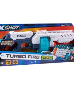 De X-Shot Turbo Fire is een blaster met een roterende cylinder waar wel 20 pijltjes in passen. Door de roterende cylinder is de X-Shot Turbo Fire heel eenvoudig te laden. De Turbo Fire is een betrouwbare blaster die heel eenvoudig te bedienen is. Omdat de blaster slam-fire heeft kun je de pijltjes razendsnel achter elkaar wegschieten. De Turbo Fire wordt geleverd inclusief 48 X-Shot pijltjes.