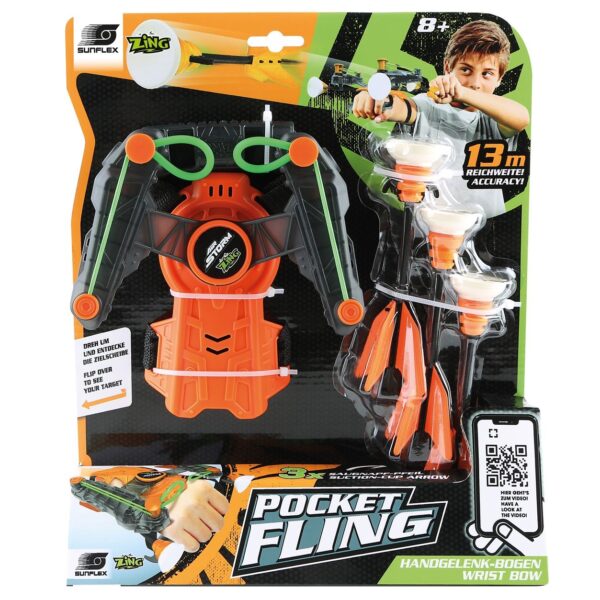 Dankzij de verstelbare polsband zit de Pocket Fling altijd stevig. Schieten is simpel: haak een zuignappijltje aan het elastiek, trek de pijl naar achteren en laat los. Je ontvangt drie veilige pijltjes met een zuignap van foam. Achter op de verpakking vind je een ingebouwd doelwit om direct aan de slag te gaan. Compact, gebruiksvriendelijk en altijd klaar voor actie. Geschikt voor spelers vanaf 8 jaar.